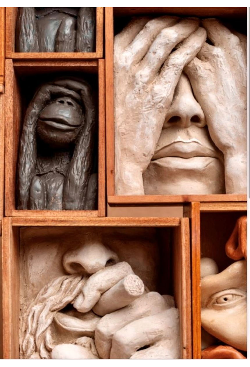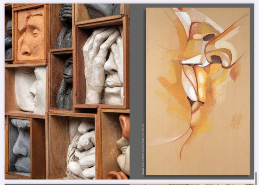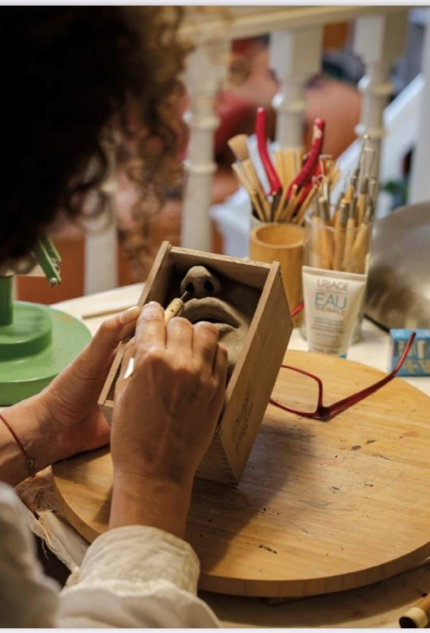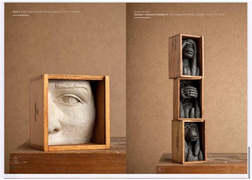 Cette exposition est construite autour de l’intrigante série de figures en argile qu’elle a sculptées directement à l’intérieur de boîtes à cigares, sans esquisse préparatoire. Le père de Sandra était amateur de cigares, aussi ces boîtes ont-elles toujours fait partie du quotidien de l’artiste. Elle avait l’habitude d’y stocker de petits objets, puis les a utilisées pour faire des meubles. En 2007, après avoir sculpté la Madone d’argile de son exposition Souls of Africa, Sandra a récupéré les chutes de terre et les a réunies dans une de ces boîtes. Frappée par la beauté des volumes, sur lesquels venaient jouer l’ombre et la lumière, elle a remodelé la matière et fait émerger du chaos un visage. Laissé de côté, ce travail a resurgi comme une évidence pendant la période du confinement, permettant à Sandra de traduire son angoisse de l’enfermement et de l’isolement et par là même de la conjurer. La série des organes sensoriels brisant les sphères dont ils sont prisonniers répond à un cauchemar concomitant: celui d’être privée de ses cinq sens, coupée ainsi de tout contact avec le monde extérieur, terreur ultime pour cette artiste et passionnée de voyages.
