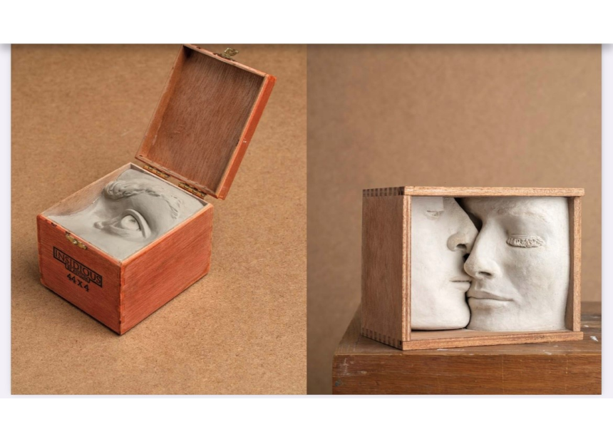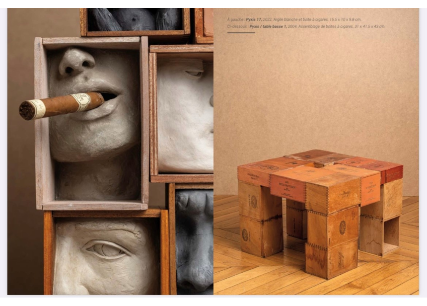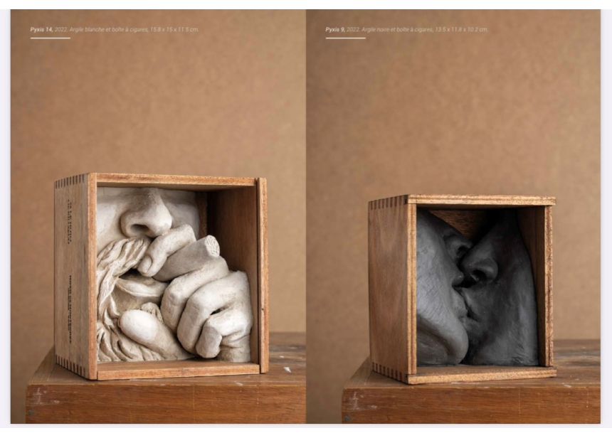 Dans sa façon de fragmenter les visages, d’isoler œil, nez, bouche, oreille…, Sandra Saab s’inscrit dans un questionnement identitaire initié au début du XXe siècle avec le cubisme et porté à son paroxysme par les surréalistes. Cette collection de visages humains «tronqués» et mis en boîte produit sur le spectateur une forte impression d’étrangeté, en même temps qu’elle entre en résonance avec les mots d’André Breton lorsqu’il évoque dans son Dictionnaire abrégé du surréalisme «cette boîte à multiple fond qui s’appelle l’homme». Le trouble ressenti est d’autant plus intense que ces visages, traités avec beaucoup de réalisme et un grand sens du mouvement, semblent doués de vie et prêts à sortir de leurs boîtes, comme dans un conte fantastique. On se laisse alors aller à la rêverie et le souvenir nous revient d’autres boîtes dont le contenu charme les sens: boîte d’optique, coffret de magicien, cabinet de curiosité... Le travail de Sandra Saab fait surtout écho au mythe grec de la boîte de Pandore, cette femme fatale façonnée dans l’argile par Héphaïstos... En libérant de la Pyxis les maux qui, depuis, affligent le monde, elle a forgé le destin de l’humanité. Or c’est précisément l’humain qui est au cœur du travail de Sandra, qui explore avec beaucoup de finesse le large spectre des émotions: tristesse, mélancolie, passion, douceur, sensualité… Avec les séries du Baiser et du Cigare, l’artiste va à l’encontre du geste de Pandore puisqu’elle capture dans ses boîtes les instants de plaisir, d’extase et de bonheur, que l’on voudrait faire durer toujours, et nous invite au carpe diem. Ces œuvres appartiennent de par leur petit format à la sphère intime; objets de fétichisme, elles sont faites pour être regardées de près, prises en main, touchées, caressées. Si chaque boîte se suffit à elle-même, la tentation est grande également de les juxtaposer, de les empiler, créant ainsi un dialogue entre les figures, des compositions aux rythmes différents, une musicalité particulière. On retrouve là une autre facette de l’artiste: la scénographie. Ces assemblages forment des petits théâtres de la condition humaine. Mais ces boîtes figurent-elles la scène ou les loges de spectateurs? Qui regarde qui? La série des Singes, particulièrement saisissante de réalisme, complète cette célébration de la vie et de l’intime par un appel à la sagesse. Dans un monde où nous sommes submergés d’images, de paroles et de bruits, où sphères publique et privée ont tendance à se confondre de plus en plus, l’artiste nous appelle à la réserve. Ce symbole des trois singes, hérité du confucianisme, fait ressortir une autre dimension des Pyxis de Sandra Saab, plus mystique, qui n’est pas sans rappeler l’artiste américaine Kiki Smith. Celle-ci développe sur des supports multiples une œuvre d’une grande spiritualité, mais aussi très organique et intuitive comme celle de Sandra, dont les organes isolés peuvent s’apparenter à des ex-voto et les boîtes à des reliquaires. Pour revenir à la pyxide, notons qu’au Moyen Âge, l’objet a changé de fonction pour servir de coffret à hosties… Pyxis est par ailleurs le nom latin abrégé de la constellation australe de la Boussole et désigne aussi une espèce de tortue, animal qui symbolise la Terre et représente la sagesse, la création et la patience.