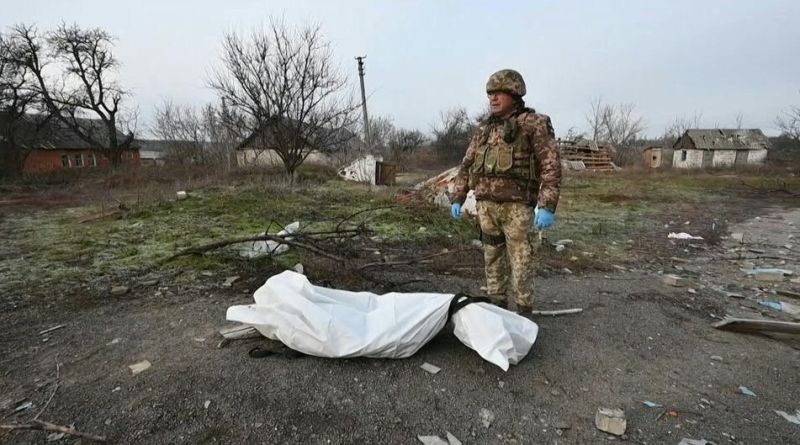 Des militaire ukrainiens évacuent des corps de soldats russes d'un hôpital détruit dans le village libéré de Petropavlivka, dans la région de Kharkiv en Ukraine. La région de Kharkiv a été sous occupation russe de février à octobre 2022.L'armée russe a quant à elle clamé samedi avoir aussi visé la veille des cibles importantes pour la défense ukrainienne.