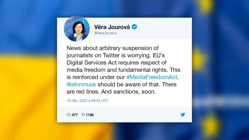 La vice-présidente de la Commission européenne, Věra Jourová, avait jugé vendredi dernier la suspension par Twitter de comptes de journalistes "inquiétante" et averti son patron, Elon Musk, qu'il y aura "bientôt" des "sanctions" applicables dans le cadre de la législation européenne."Si des violations à la règle restent un acte isolé ou une première infraction, nous pourrons prendre un certain nombre de mesures allant de la suppression d'un ou plusieurs tweets jusqu'au verrouillage temporaire de compte(s)", détaille Twitter.