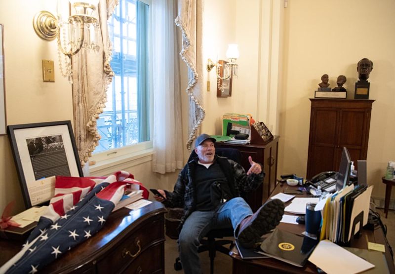Richard Barnett, un militant pro-Trump, dans le bureau de la présidente de la Chambre des représentants des États-Unis, Nancy Pelosi lors de l’assaut du capitole le 6 janvier 2021. ©AFP/Saul Loeb
