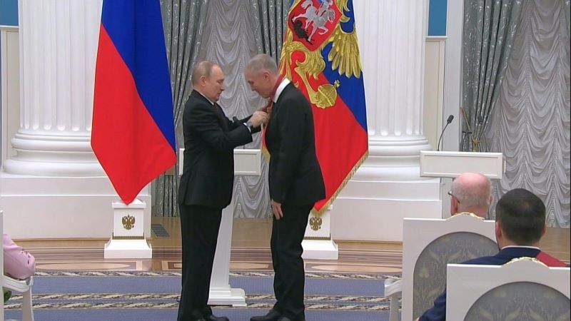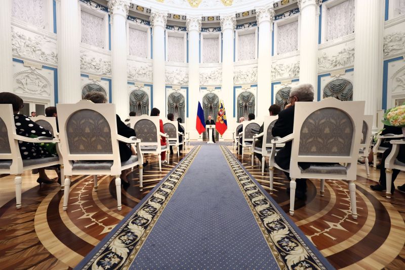 Le président russe Vladimir Poutine remet des décorations à diverses personnalités politiques lors d'une cérémonie au Kremlin, alors que ses soldats sombrent dans le bourbier ukrainien.