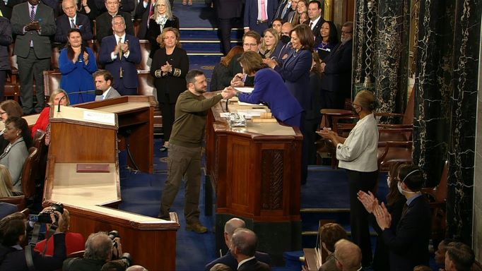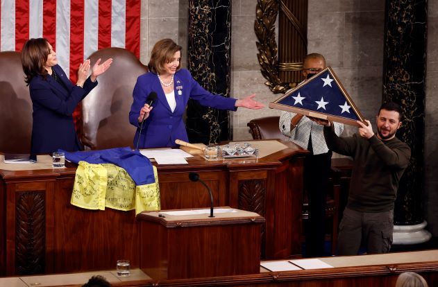 Zelensky a offert à Kamala Harris et Nancy Pelosi le drapeau ukrainien couvert de signatures de soldats. En retour, elles lui ont remis un drapeau américain ayant été hissé au sommet du Capitole mercredi pour marquer sa visite historique.Accueilli par une ovation debout des membres de la Chambre des représentants et du Sénat, le président ukrainien, vêtu de sa traditionnelle tenue kaki, en anglais et avec la plus grande solennité, a dit: "Contrairement aux prédictions les plus funestes, l'Ukraine n'est pas tombée. L'Ukraine est vivante et combative."