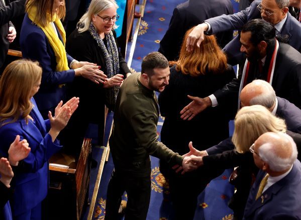 Accueilli par une ovation debout des membres de la Chambre des représentants et du Sénat, le président ukrainien, vêtu de sa traditionnelle tenue kaki, en anglais et avec la plus grande solennité, a dit: "Contrairement aux prédictions les plus funestes, l'Ukraine n'est pas tombée. L'Ukraine est vivante et combative."