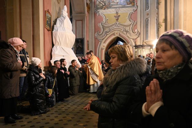 Des fidèles recevant l'Ostie dans la cathédrale de Lviv.Si l'état-major russe a confirmé viser la conquête de la totalité de la région industrielle de Donetsk, Volodymyr Zelensky a lui juré vouloir reprendre les quatre régions ukrainiennes annexées fin septembre par la Russie - Donetsk, Lougansk, Zaporijjia, Kherson -, ainsi que la péninsule de Crimée, annexée en 2014.