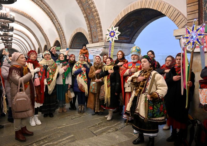 Portant des habits traditionnels, des habitants de Kiev récitent des chants de Noël dans le meilleur abri de la capitale contre les bombes: les stations de métro.Dimanche à Kiev, des orthodoxes ont fêté Noël, aux côtés des catholiques. L'Ukraine, un pays dont la population est en majorité orthodoxe, est, en effet, divisée entre une Église dépendant du Patriarcat de Moscou, qui a annoncé rompre ses liens avec la Russie fin mai du fait de l'offensive russe, et une Église indépendante de la tutelle russe.