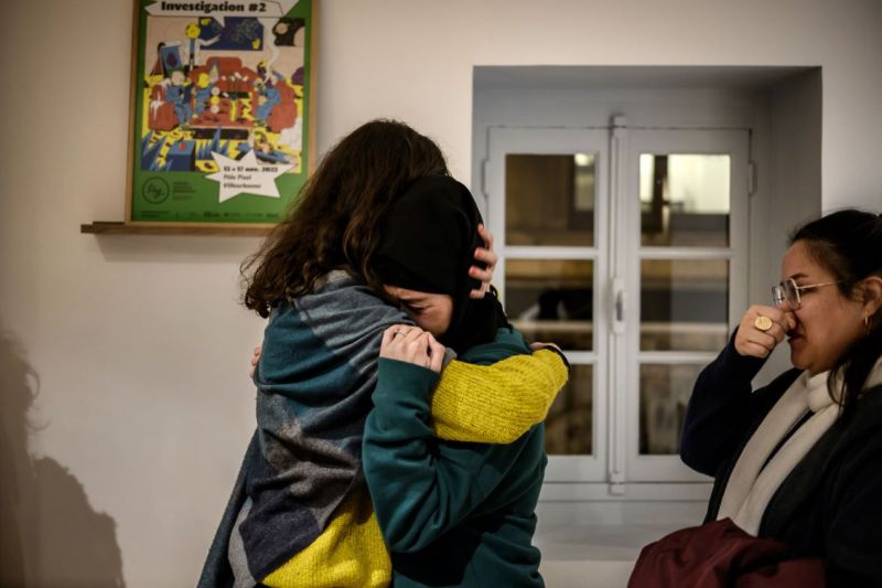 Les membres de l'Afghan Girls Theatre Group, compagnie de théâtre d'actrices afghanes ayant fui le régime taliban, réagissent après la répétition générale de la pièce Le Rêve Perdu créée en collaboration avec le Théâtre Nouvelle Génération de Lyon (TNG). (AFP)Pauvreté et humiliation