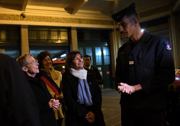 La Première ministre Elisabeth Borne et la maire de Paris, Anne Hidalgo, ont choisi de visiter les forces de l'ordre. 90.000 policiers ont été mobilisés pour le soir du Nouvel An. Sur cette photo, l'édile et la cheffe du gouvernement en pleine conversation avec un sapeur-pompier géant...