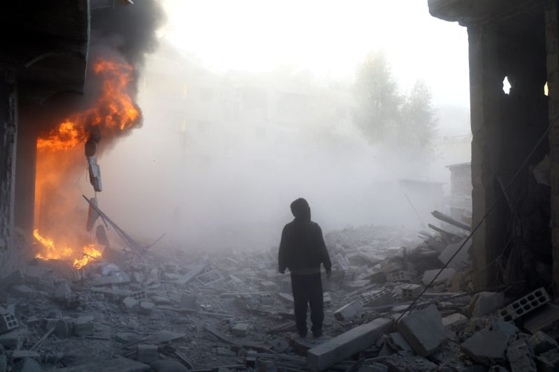 Un homme marche près d'un immeuble en feu à la suite d'une frappe aérienne dans la région tenue par les rebelles de la Ghouta orientale, à la périphérie de la capitale syrienne Damas , le 8 décembre 2015. (ABDULMONAM EASSA / AFP)L'AFP en a débusqué plusieurs, dont une en novembre prétendant montrer des tanks russes frappés par des missiles Javelin et visionnée des dizaines de milliers de fois.