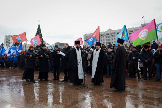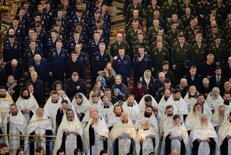Une messe pour les officiers en la cathédrale du Christ-Sauveur à Moscou.Signe de l'importance de ces religieux dans le conflit, M. Poutine a décerné en novembre le titre de "Héros de la Fédération de Russie", plus haute distinction du pays, à un prêtre orthodoxe tué dans la zone de combats, Mikhaïl Vassiliev.