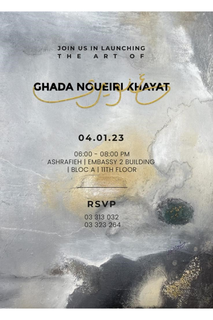 Ghada Noueiri Khayat, peintre autodidacte, nous charme par sa douceur et sa sensibilité à fleur de peau. Elle nous invite à découvrir sa passion pour la peinture, ses talents artistiques, qu’elle finit par dévoiler début 2023 au public, exposés dans son propre appartement.