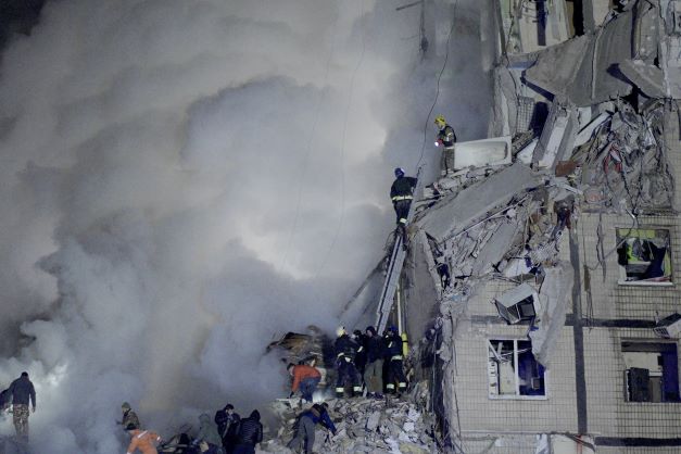 Des équipes de secouristes interviennent dans un quartier de la ville de Dnipro, dans l'est de l'Ukraine, où un missile russe a frappé un immeuble résidentiel et provoqué la mort de plusieurs civils.Quid de Soledar?