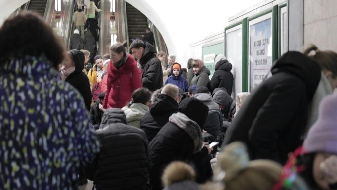Des habitants de Kiev se réfugient dans le métro pendant un raid aérien dans le centre ville. Le gouvernement a annoncé une alerte aérienne dans de nombreuses régions d'Ukraine.