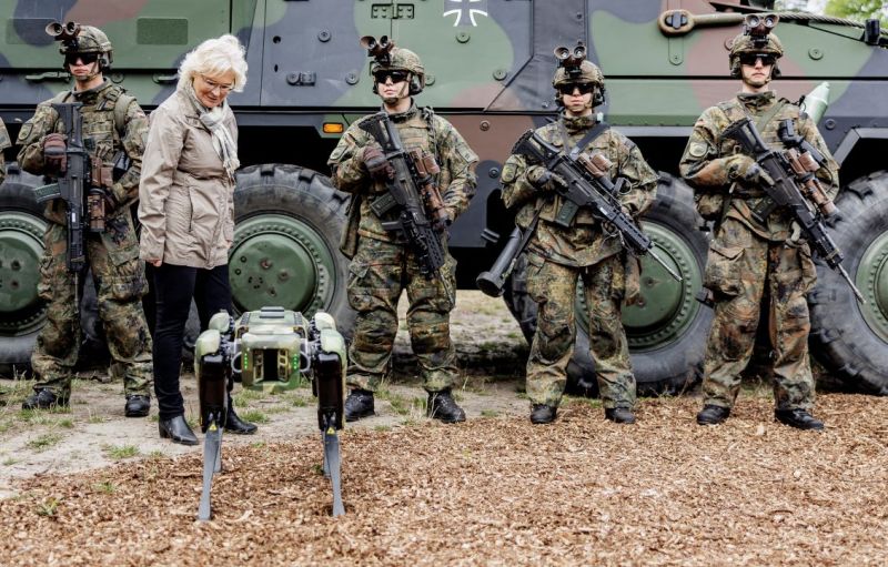 Christine Lambrecht découvrant l'espèce d'un chien-robot de l'armée.