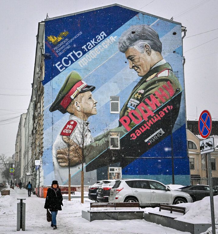 Des piétons passent devant une peinture patriotique à Moscou (AFP)