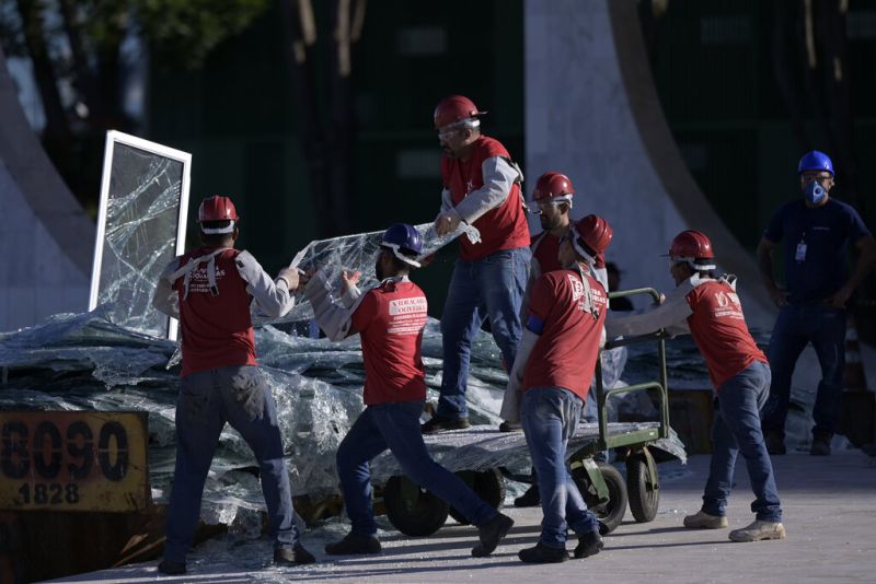 Des ouvriers effectuent les travaux de nettoyage et de rénovation du bâtiment de la Cour suprême du Brésil après sa destruction par des partisans de l'ancien président brésilien Jair Bolsonaro (AFP)Des infrastructures, des œuvres d'art inestimables et du mobilier faisant partie du patrimoine national ont été détruits par les émeutiers, qui ont laissé derrière eux des graffitis appelants à un coup d'État militaire.
