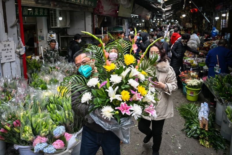 Le marché aux fleurs de Wuhan oscille entre lanternes rouges et chrysanthèmes pour préparer le réveillon du Nouvel an lunaire, trois ans après l'arrivée d'un virus qui a provoqué une pandémie mondiale et plongé la Chine dans de durs confinements.