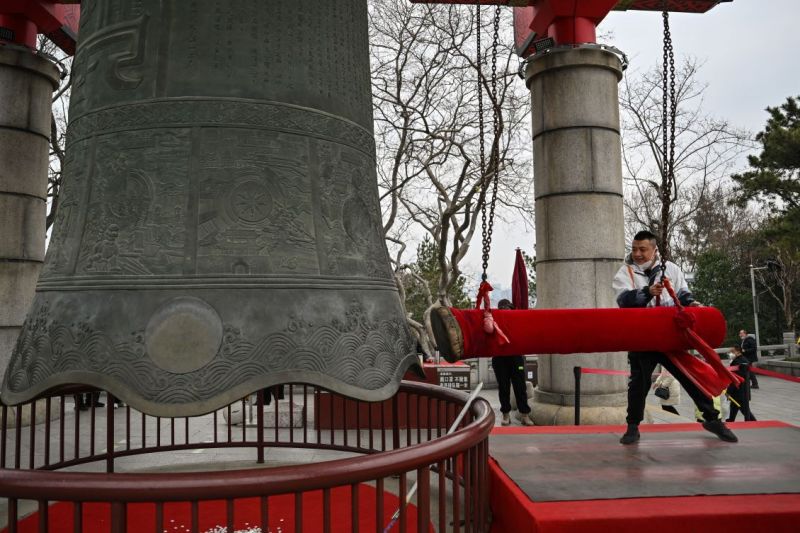 Un homme frappe une cloche en visitant la Yellow Crane Tower à Wuhan. (AFP)