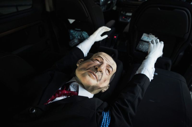 Une effigie du président turc Recep Tayyip Erdogan à l'arrière d'une voiture d'Andreas, 39 ans, membre du comité suédois de solidarité pour le Rojava, à Stockholm. Leur action a jeté une autre clé dans les efforts de la Suède pour rejoindre l'OTAN. (AFP)