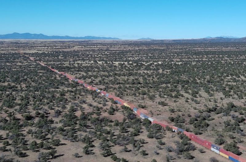 Ressemblant à un train traversant le désert, une longue rangée de conteneurs d'expédition empilés pour créer un mur entre les États-Unis et le Mexique attend son retrait dans la forêt nationale de Coronado près de Hereford, en Arizona, le 20 janvier 2023. (Robyn BECK / AFP)"Je n'arrive pas à croire que le gouverneur Ducey puisse penser que c'était une bonne idée", souligne à l'AFP Debbie McGuire une ancienne habitante de l'Arizona venue assister aux opérations de démantèlement.