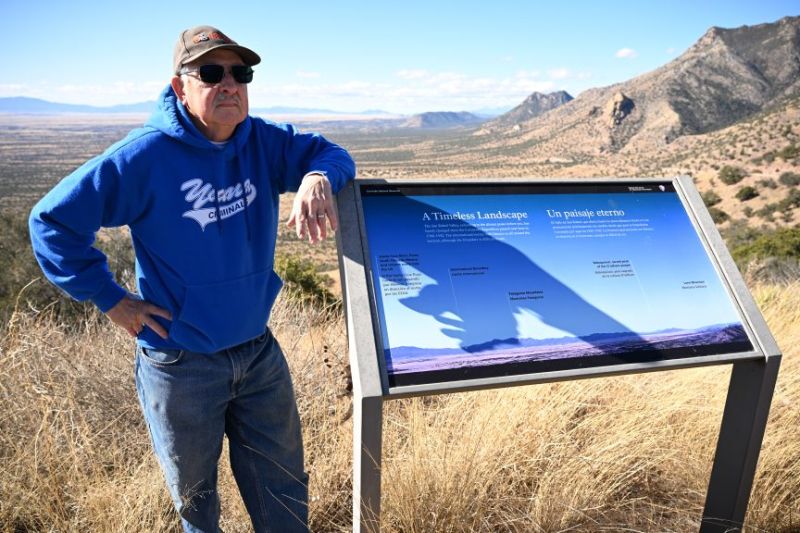 Bill Wilson pose devant le Coronado National Memorial. Le mur du conteneur d'expédition traverse un carrefour biologique, incorporant quatre zones écologiques distinctes : la Sierra Madre, le désert de Chihuahua, les Rocheuses et le désert de Sonora. 20 janvier 2023. (Robyn BECK / AFP)L'Arizona partage quelque 600 kilomètres de frontière avec le Mexique, passant par des aires protégées, des parcs nationaux, des zones militaires et des réserves amérindiennes.