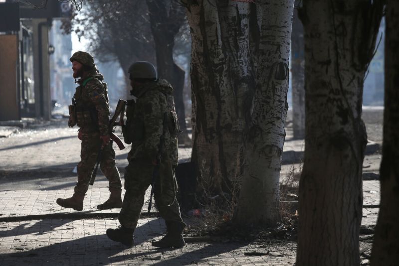 Des militaires ukrainiens marchent dans une rue de Bakhmut, dans la région de Donetsk (AFP)Un de ses conseillers, Ian Gagine, a indiqué vendredi à l'agence Tass que "des combats sérieux, brutaux" étaient en cours et que les forces russes se sont "implantées dans le sud-est et l'est de la ville".