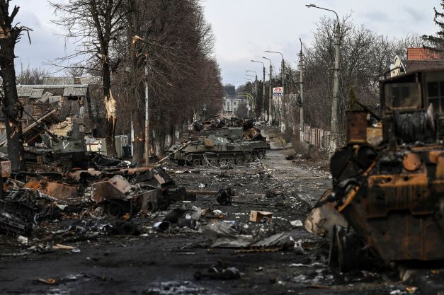 Un soldat russe tué devant son blindé aux premiers jours de l'invasion de l'Ukraine.Les Européens ont débloqué sans compter des milliards d’euros pour subventionner leurs entreprises et aider leurs citoyens, tandis qu’un hiver doux a contribué à amortir l’impact du sevrage.