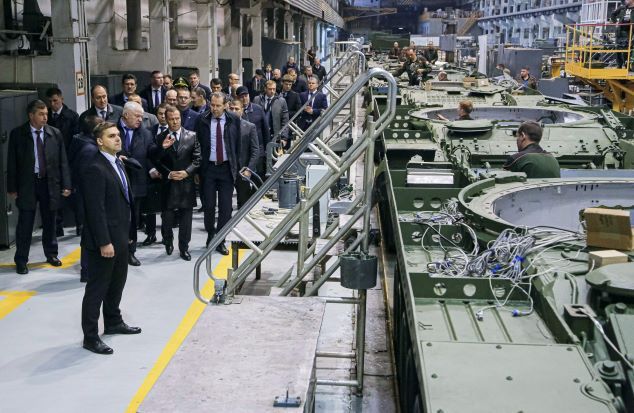 Dmitri Medvedev, ancien président russe et actuel vice-président du puissant Conseil de sécurité, inspecte une usine de chars dans l'Oural: les forces russes ont rapidement souffert de pertes importantes en matériel et véhicules militaires.
