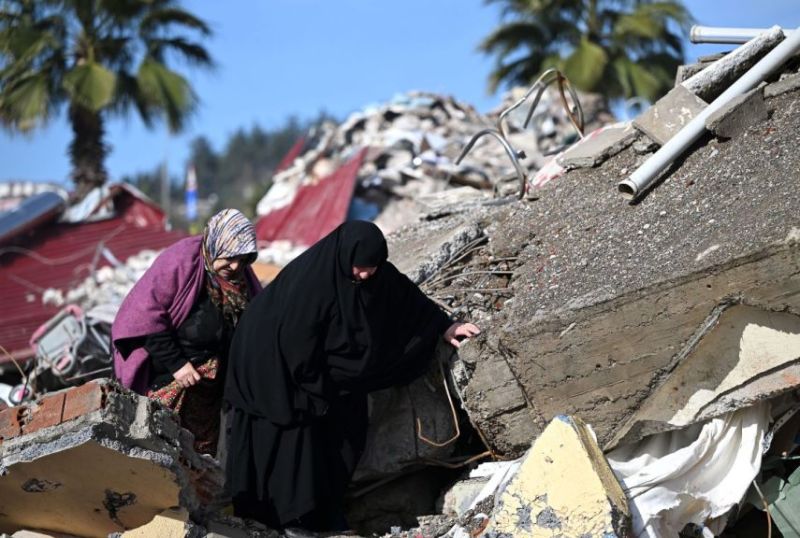 Deux femmes traversent les décombres près de l’épicentre du séisme à Kahramanmaraş en Turquie. (AFP)Jeudi à Samandag, dans la province de Hatay, les secours avaient pu dégager vivants un bébé de 10 jours et sa mère, après 90 heures sous les décombres, selon le maire d'Istanbul, Ekrem Imamoglu.