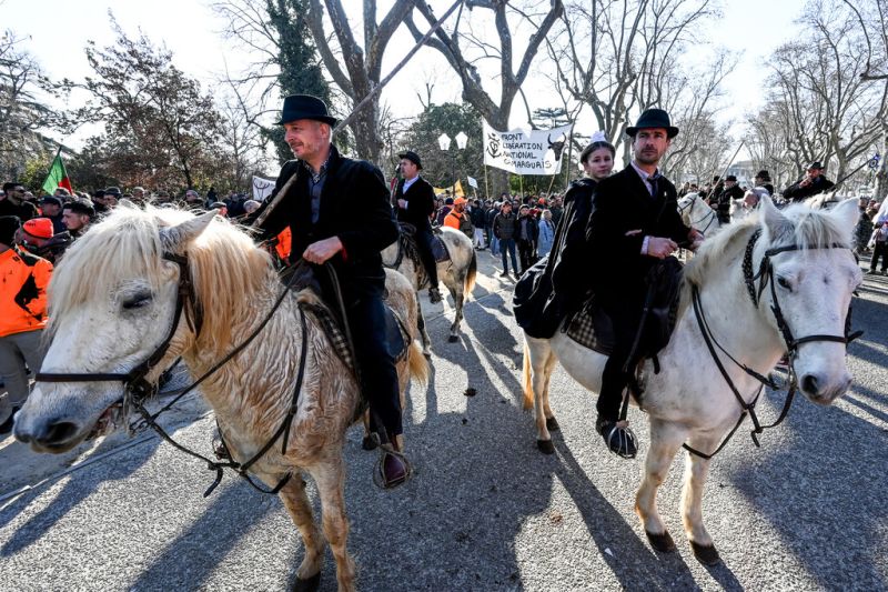 Des guitares gitanes, des "gardians" sur leurs chevaux blancs camarguais, des maires ceints de leur écharpe, des Arlésiennes en costume...les mondes de la tauromachie et de "la ruralité" ont défilé en masse samedi à Montpellier pour défendre leurs traditions contre les "écolos bobos".
