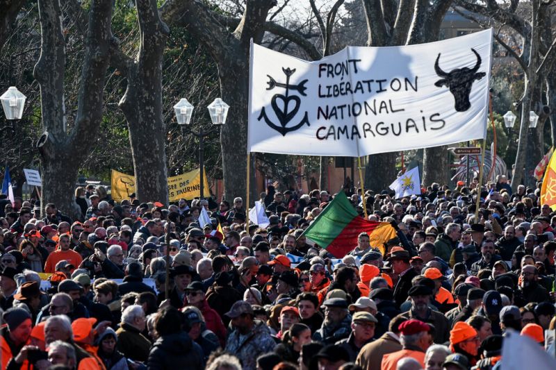 Des manifestants brandissent un drapeau du "Front de libération de la Camargue" lors d'un rassemblement appelé par des éleveurs camarguais (AFP)