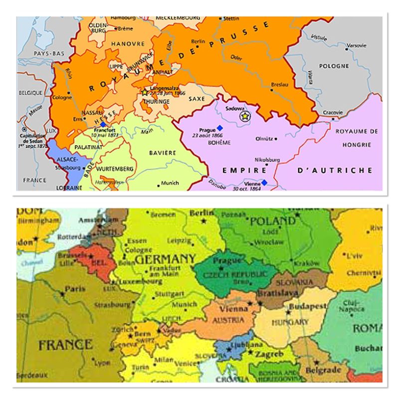 Les frontières ne sont ni immuables ni sacrées: carte de l’Europe centrale hier (en haut, © Archives Larousse) et aujourd’hui (en bas, photo tirée du site www.europa-planet.com).La géographie