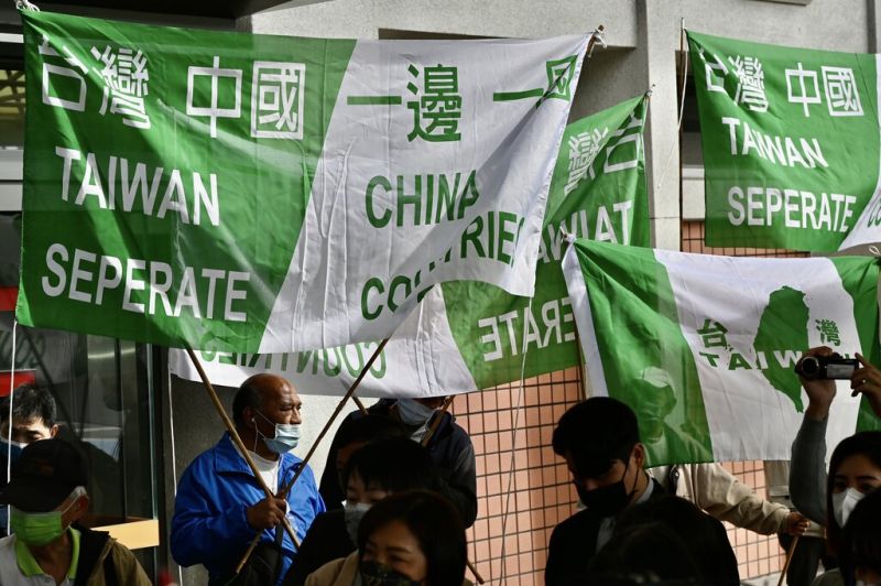 Des militants de l'indépendance de Taïwan arborent des banderoles lors d'une manifestation avant l'arrivée à Taipei des responsables des affaires taïwanaises de la Chine (AFP)"Les pressions et les tentatives pour contenir la Chine, venant de l'extérieur, sont de plus en plus fortes" et "constituent une menace sérieuse pour la souveraineté et la sécurité de la Chine", a déclaré Qin Gang.