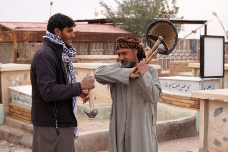 Le travail des fossoyeurs s'est accru avec la pandémie de Covid-19 (Photo de Qassem al-KAABI / AFP)Plus récemment, la pandémie de Covid-19 a provoqué une surmortalité et donc un surcroît de travail pour Thamer Moussa Hreina, 43 ans dont 20 comme fossoyeur. "Pendant le coronavirus, on a eu 5.000 à 6.000 corps en plus sur une année", assure-t-il.
