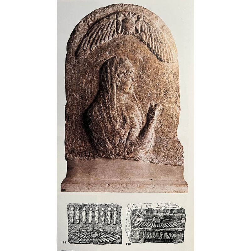 Stèles de Tyr (n°188 et 189) et de Sidon (n° 190), comportant le disque de Hélios ailé, emblématique des stèles et temples phéniciens. ©Mission de Phénicie, Calmann-Lévy, 1864; dessins d’Édouard Lockroy.La religion phénicienne