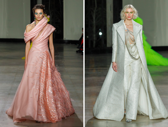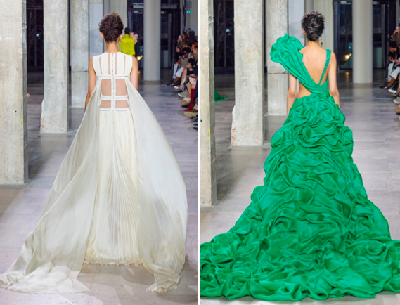 Photo crédit : www.georgeschakra.comL’amour du créateur pour le gazar de soie se fait remarquer dans la collection. Les volumes anguleux et ondoyants et les formes épurées se marient dans une symbiose parfaite. Les robes aux bustiers ajustés soulignent le corps et se terminent par de longues traînes en soie qui assurent l’effet couture. Chaque look est une véritable sculpture en soi, avec des cols qui occupent une place centrale dans l’inspiration de cette saison. Démonstration d'héritage et de savoir faire, le plissé, somptueux et omniprésent, souligne l’incomparable maîtrise des ateliers Georges Chakra pour ces techniques qui donnent une force et une dimension supplémentaire à la collection.
