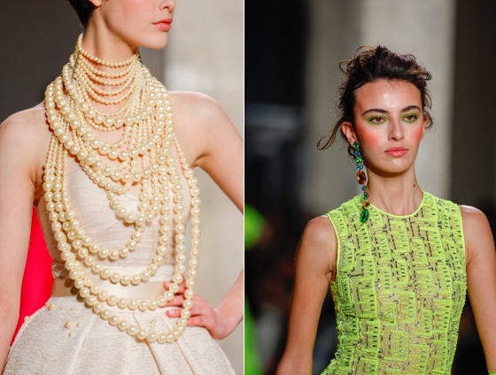 Mention spéciale aux bijoux, tantôt audacieux, tantôt surdimensionnés, qui viennent compléter cette collection. D'énormes perles habillent les torses dénudés, bracelets et manchettes recouvrent les poignets et de longues boucles d’oreille tombent sur une épaule. Les mules en satin champagne ou argent aux délicats talons néon, issues des archives de la Maison, connaissent une nouvelle interprétation.
