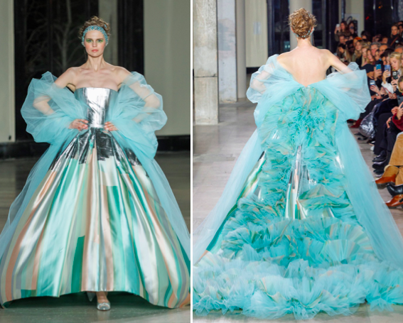 Pour un final spectaculaire, la robe de mariée apparaît enfin sur le podium. Une première pour la Maison, cette robe exceptionnelle est réalisée en soie Mikado imprimée de bandes bleu et rose pastel, peintes à la main, avec de grands traits d’argent métallisé. Comme pour toute traditionnelle robe de bal, la traîne est composée de dizaines de tourbillons de gazar imprimé et de tulle bleu glacier, plissés et assemblés comme des vagues, retombant en une volumineuse et somptueuse cascade.