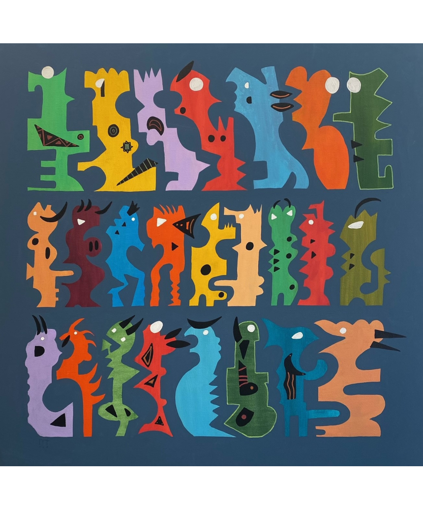 Les couples sont exposés de manière poétique et expressive sur des peintures monochromatiques où le coq disparaît. Les groupes ou les familles, si l’on voulait les interpréter ainsi, se manifestent avec différentes couleurs et formes asymétriques aux allures de poissons ou d’hippocampes.