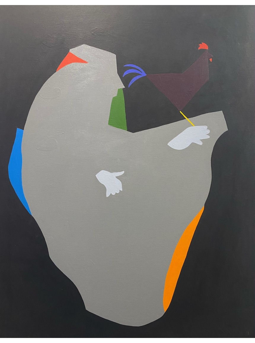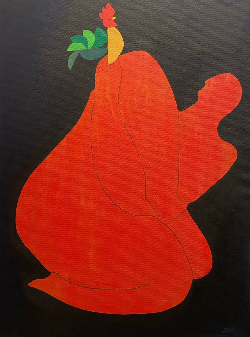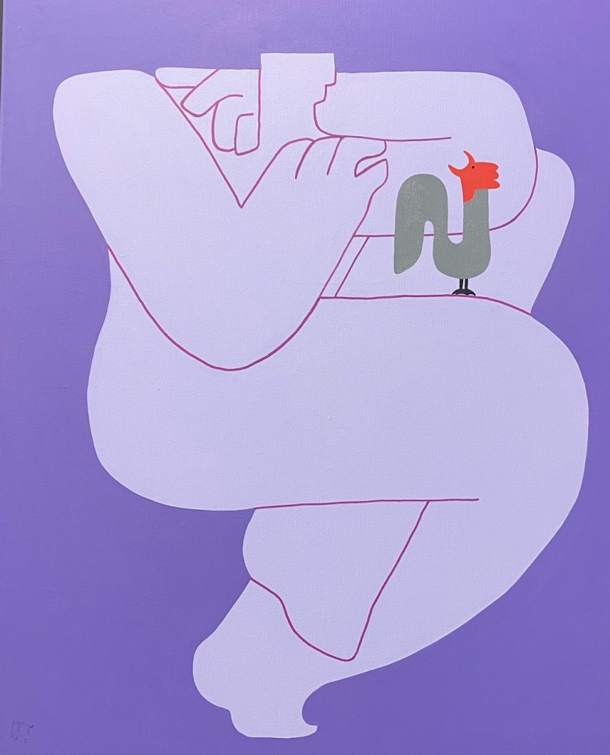 Quant au coq, symbole de l’homme macho par excellence, on le retrouve partout sur les compositions de l’artiste. Peint avec tout son panache et des couleurs chatoyantes, il se pose sur la courbe d’un rein ou dans le glissement d’un sein. Il est là, présent au centre de la féminité.