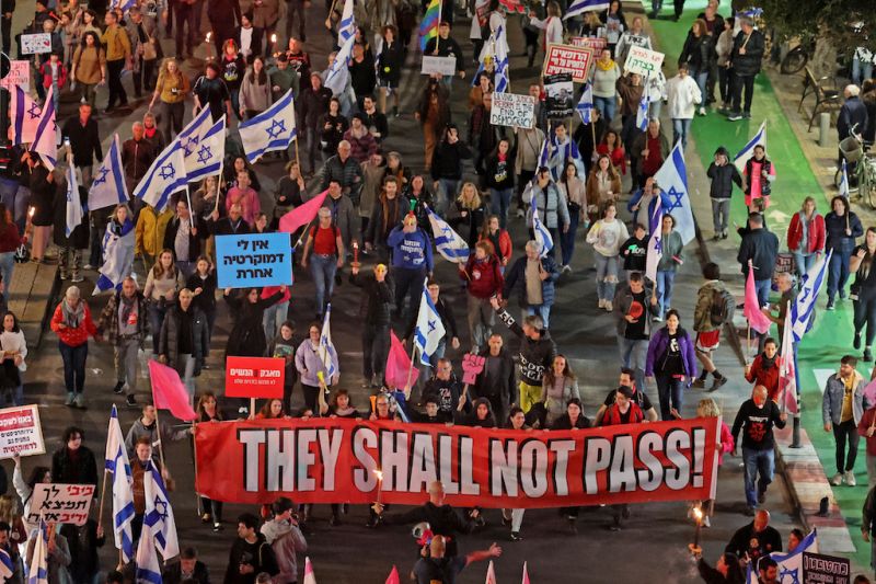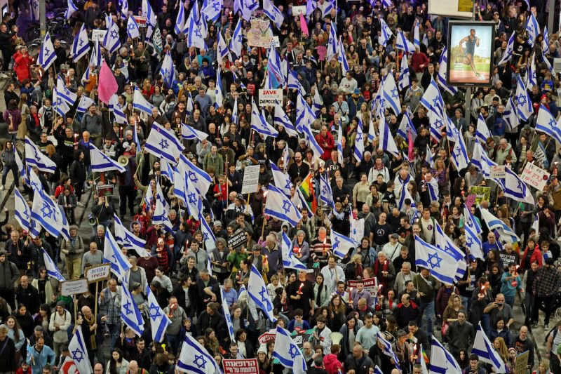 Plusieurs milliers d'Israéliens sont, encore une fois, descendus dans les rues de Tel-Aviv le 25 février. Tous protestent toujours contre la réforme du système judiciaire du gouvernement d'extrême-droite de Netanyahu et espèrent protéger, de manière plus générale, leur État, qu'ils considèrent comme démocratique.