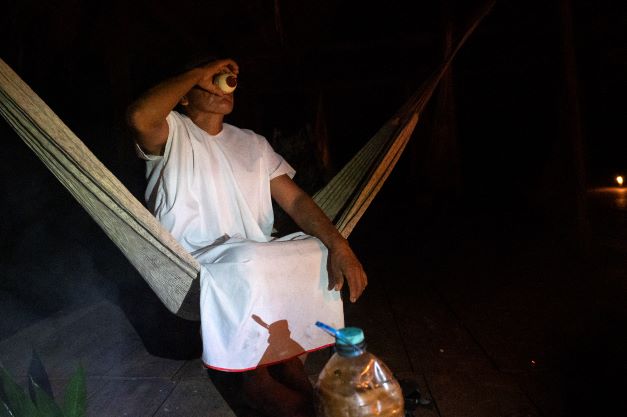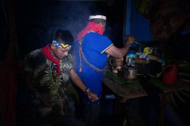 Dans la famille Lucitante, la cérémonie a lieu à la nuit tombée, dans la maloca familiale, peinte de perroquets, serpents et têtes de panthères multicolores, ainsi que des visages des illustres anciens.