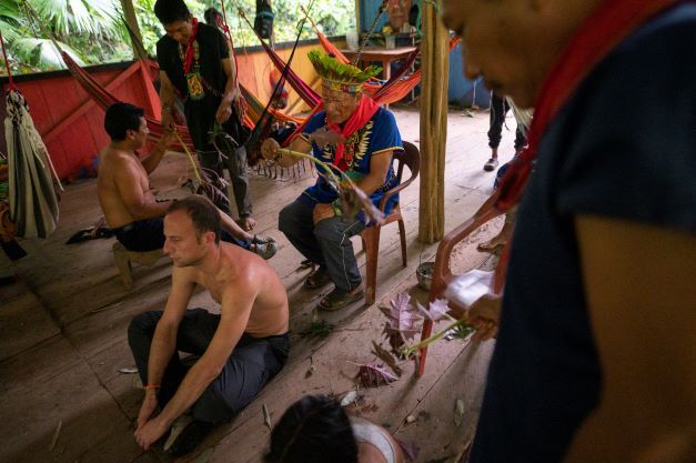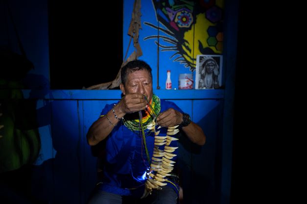Collier de dents de pécaris sur la poitrine, foulard rouge autour du cou et plume en travers du nez, ce "héros de la biodiversité", comme le désignent certaines ONG, officie ce soir au côté de son père comme assistant et chanteur à la guitare pour accompagner le voyage et la transe des participants.