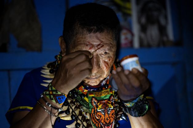 Isidro Lucitante, un guérisseur de la communauté des Cofan Avie, peint son visage avant une cérémonie. (Photo de Pedro PARDO / AFP)"La plante est tout pour nous, au même titre que notre territoire. Nous ne pourrions vivre sans l'un ou l'autre. C'est grâce à la médecine du yagé que nous pouvons nous connecter aux esprits et (...) rééquilibrer le monde. Le yagé est un chemin sacré qui nous invite à vivre en harmonie avec la nature".