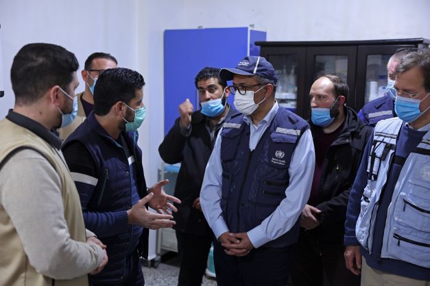 Tedros Adhanom Ghebreyesus visite l'hôpital al-Sham à Sarmada (Photo de OMAR HAJ KADOUR / AFP)Le séisme du 6 février a fait plus de 50.000 morts en Turquie et en Syrie. Le bilan pour la Syrie s'élève à près de 6.000 morts.
