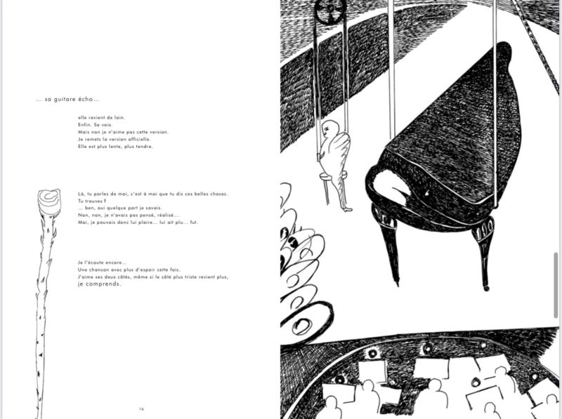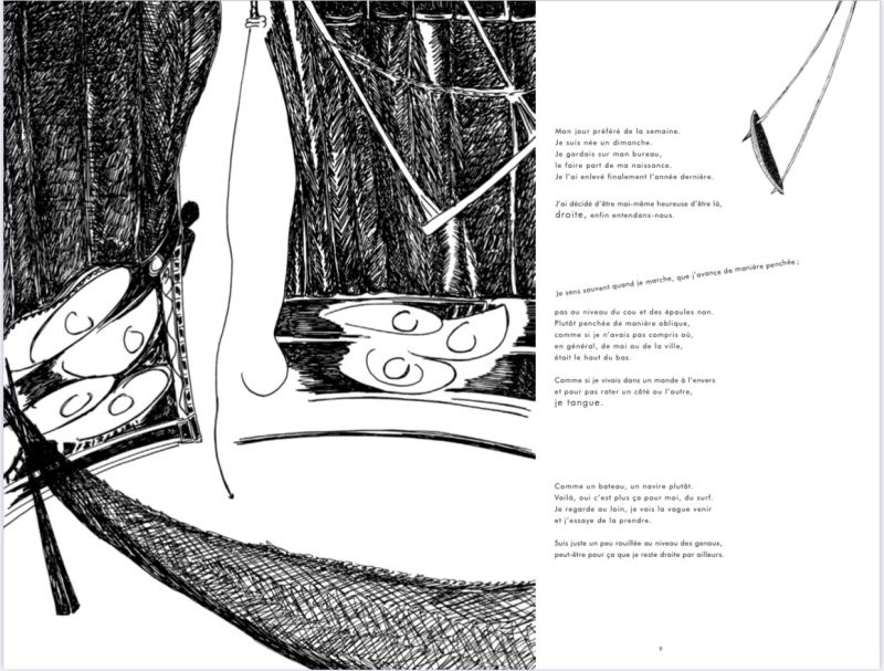 Vanessa Gemayel: Je connais le travail du Tricoteur depuis très longtemps et je dirais que son influence est très présente dans mon travail, aussi bien dans mon monde visuel que dans celui de l’écrit. Je travaillais sur ce texte, intitulé à la base «La chanteuse bleue», depuis 2017 à peu près, et je savais/ je voyais aussi les dessins du Tricoteur, les nouveaux qui commençaient à évoluer petit à petit vers un thème qui les unirait au final. Quand j’ai enfin fini le texte, le Tricoteur avait également fini sa nouvelle série de dessins. C’est un accident, un grand et bel accident que les deux se retrouvent, ou une coïncidence aussi, mais, au final, tout accident n’est autre que coïncidence avec un boum.