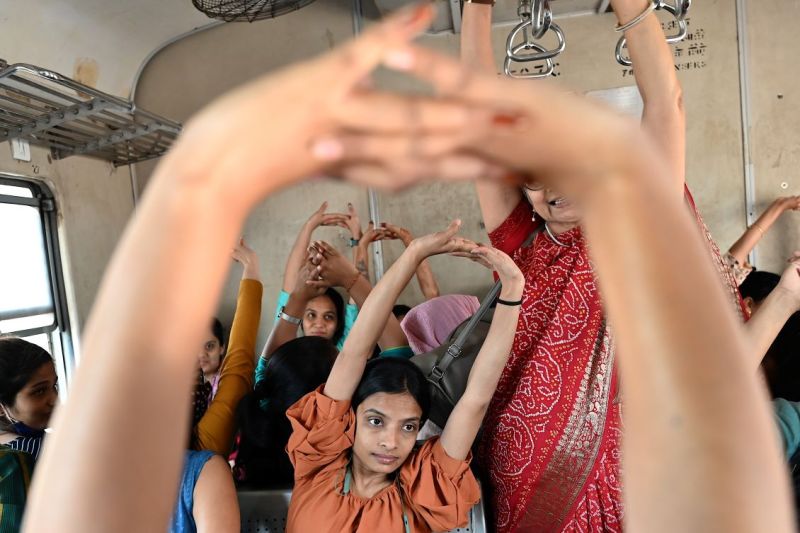 Les navetteurs voyageant dans un wagon pour femmes d'un train local exécutent des postures de yoga tout en suivant un cours de yoga dirigé par un instructeur (non illustré) à l'occasion de la Journée internationale de la femme à Mumbai. (AFP)Marée violette aux Amériques