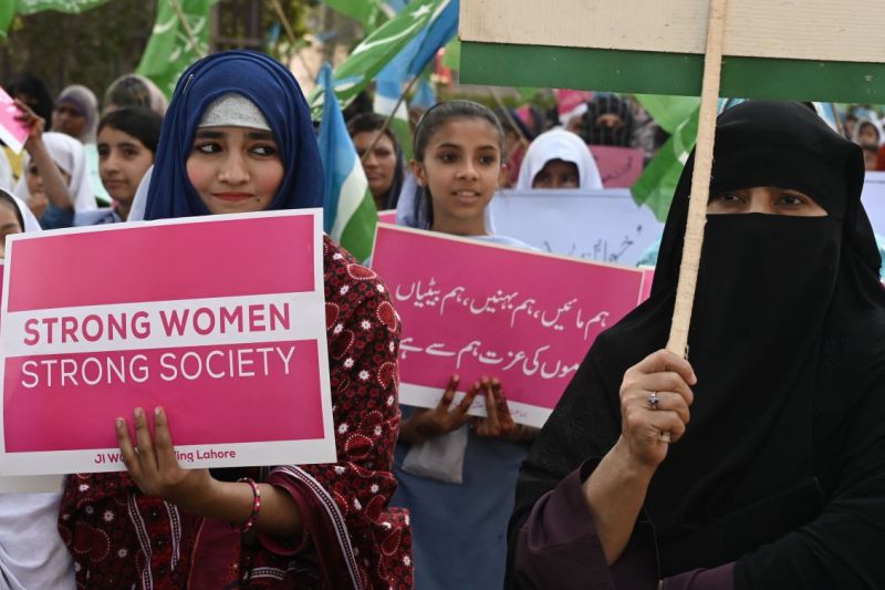 Des militantes du parti Jamaat-e-Islami (JI) tiennent des pancartes et des drapeaux du parti alors qu'ils défilent lors d'un rassemblement pour marquer la Journée internationale de la femme à Lahore. (AFP)Luttes afghanes, luttes iraniennes