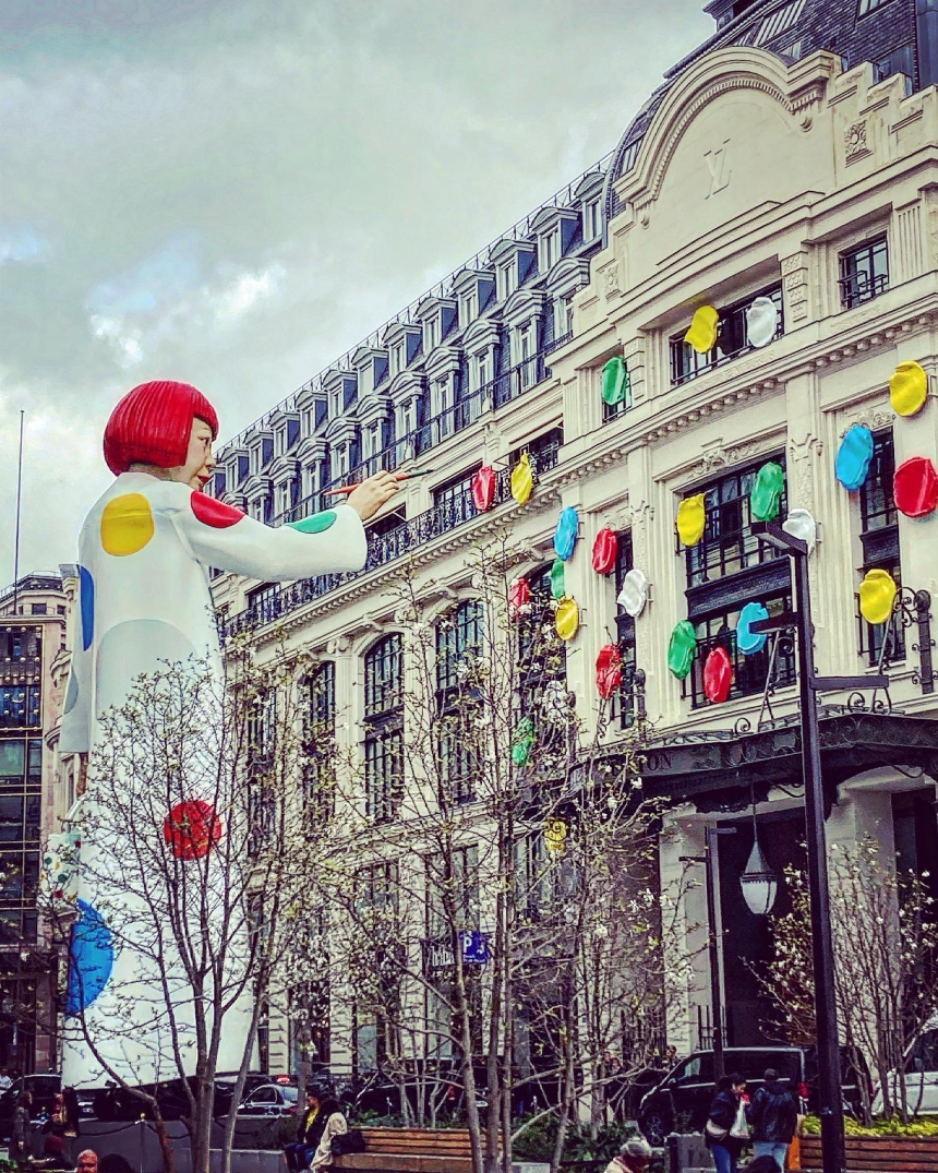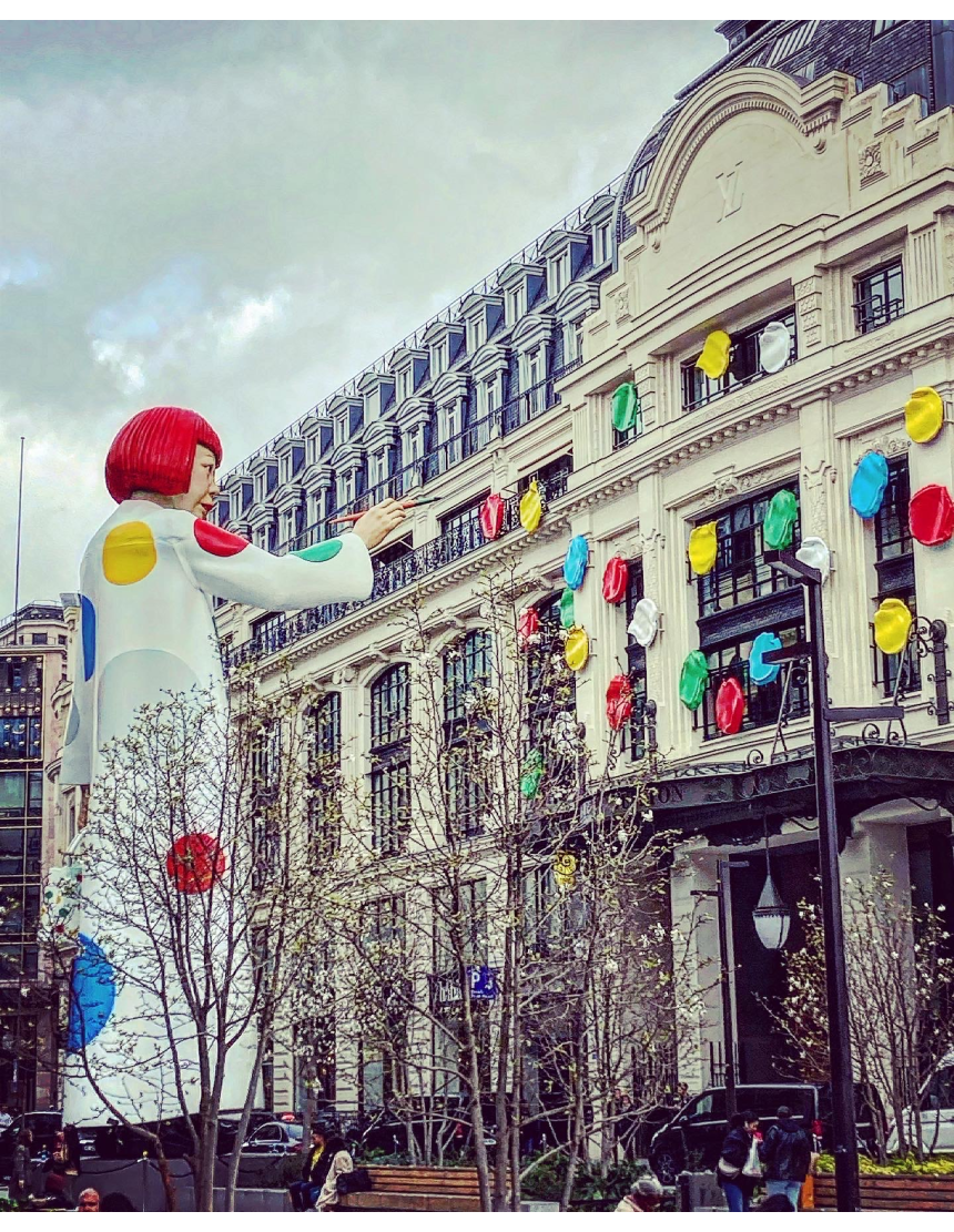 LVMH, alliant avec maestria et vision art et technologie, savoir faire et faire savoir, joue du clone monumental de l’artiste, tel un kingkong géant – non pas escaladant les façades... mais qui sait, pour les prochaines installations? Installant une fresque géante dans une réalité décuplée, LVMH souffle un vent d’une incroyable et épatante modernité, dépassant de loin ses concurrents dans la course effrénée du luxe, et se plaçant assurément en précurseur dans une nouvelle galaxie. Dans ce nouvel espace, l’aventure contemporaine est devenue celle d’une conquête commerciale, basée sur le virtuel, l’artistique et le supratechnologique, où, dans ce cas précis, le rêve est peint par le pinceau de l’incroyable Yayoi Kusama.