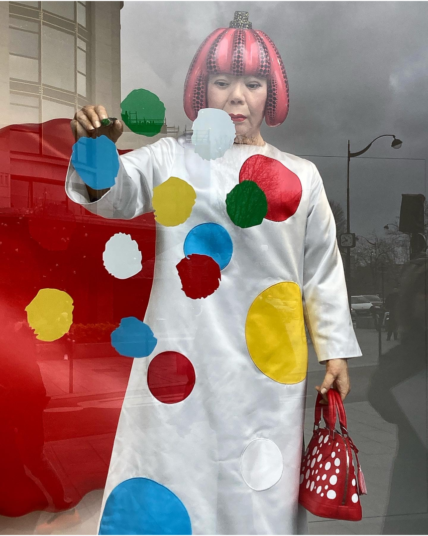 C’est avec un immense plaisir, pour les yeux en premier, que ses polkas dots s’impriment avec une technique particulière de sérigraphie, créant la texture et le relief d’une couche de peinture sur les sacs emblématiques de Louis Vuitton. Allant toujours plus loin dans cette collaboration fructueuse, un sac a même été créé dans l’esprit des fameuses citrouilles à pois de notre artiste japonaise, devenant elle-même, physiquement, personnage de son propre art.